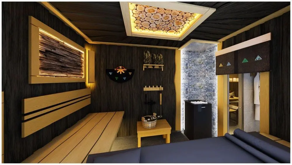 Тёмный стиль бани обеспечит полное погружение в таинство парения. Баня, наполненная паром, ароматами можжевельника, кавказских трав и фруктовых деревьев подарит незабываемые эмоции. Изюминкой данного проекта является потолок в виде солнца с лучами, визуально увеличивая пространство.