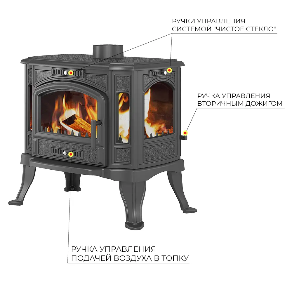 Печь-камин Везувий KZ-14SР "Антрацит" изготовлена из качественного чугуна с толщиной стенки 8-10 мм. Модель рассчитана на обогрев помещений объёмом до 280 м³.Топочная камера с двойными чугунными стенками. В нижней панели предусмотрена колосниковая решётка. Дверь изготовлена из чугуна и оснащена большим панорамным стеклом в виде арки. С двух сторон от двери установлены две стеклянные вставки. На модели KZ-14Р по бокам установлены стекла. Чистота стекла во время работы обеспечивается системой подачи воздуха на внутреннюю сторону стекла. Воздух отсекает дымовые газы и пламя от поверхности стекла, предотвращая закопчение и потемнение стекла. На моделях  KZ-14 , KZ-14S ручка управления системой размещена в верхней части передней панели, над дверью у KZ-14Р с боку над стеклом. В нижней части двери размещена ручка задвижки для подачи воздуха на первичное горение