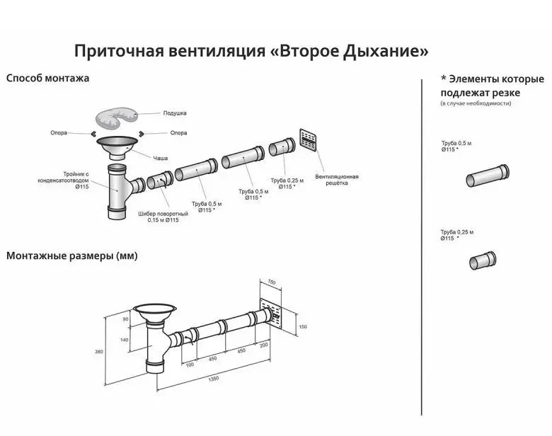 Система второго дыхания в бане и сауне проста и эффективна. Данная система используется для подачи воздуха непосредственно к лицу человека во время парения, а также может быть использована просто для подачи свежего воздуха в парную. Система второе дыхание состоит из набора труб, вент решётки, шибер-заслонки, тройника, чаши и удобной подушки. В чаше предусмотрена возможность регулирования подачи свежего воздуха, так же регуляция подачи воздуха может осуществляться парильщиком при помощи шибер-заслонки. В чашу можно положить какие-либо травы для аромата.