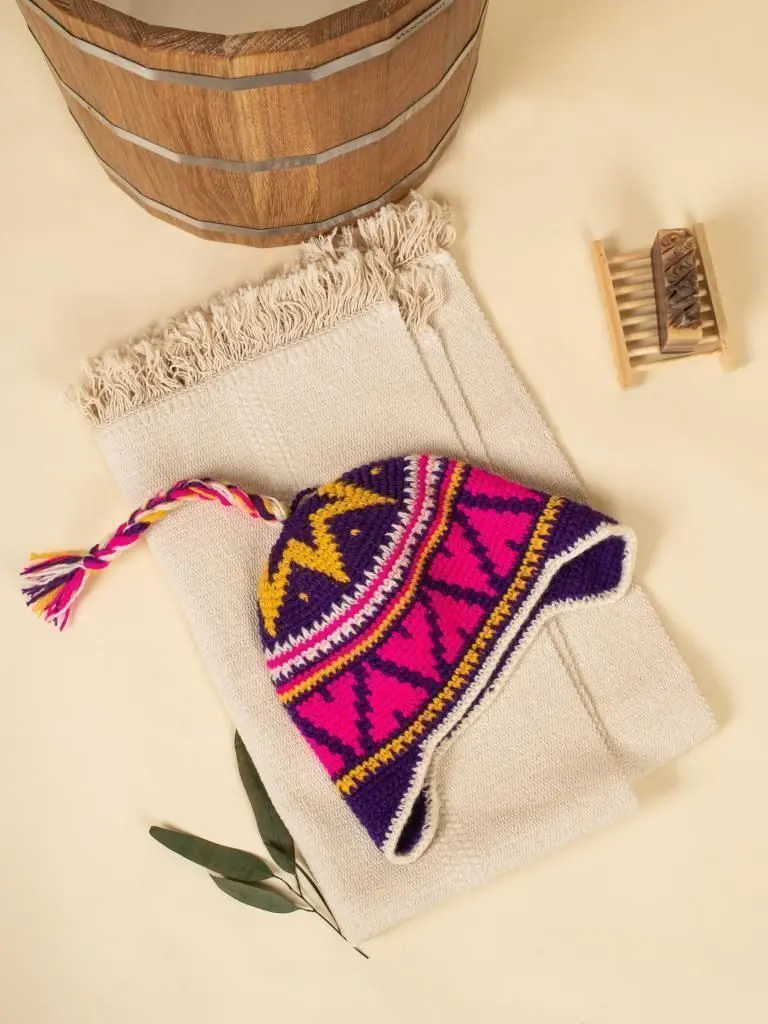 Вязаные шапка ручной работы в различных цветах и размерах  Изделие обеспечит защиту от перегрева головы в бане или сауне. Вязка достаточно плотная, а орнаменты выдержаны в цветовом решении ковриков Woodson. Шапки наилучшим образом поддаются стирке и сушке, не меняют размер после многократного использования.  Шапка упакована во влагозащитную и премиальную упаковку.