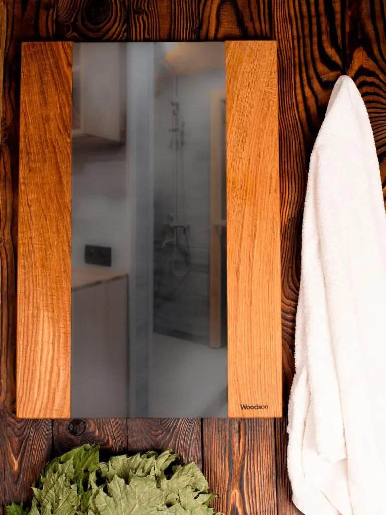 Зеркало Woodson отлично смотрится в любом интерьере: зоне отдыха, ванной комнаты или душевой. Обрамление выполнено из массива ольхи, дуба или липы.